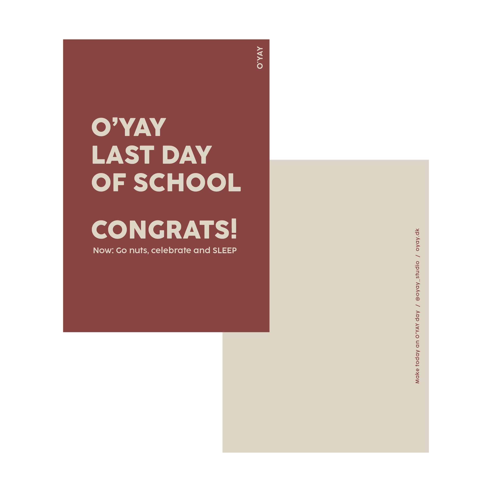 Greet & Keep kort med teksten: “O’YAY Last day of school. Congrats! Now: Go nuts, celebrate and SLEEP”